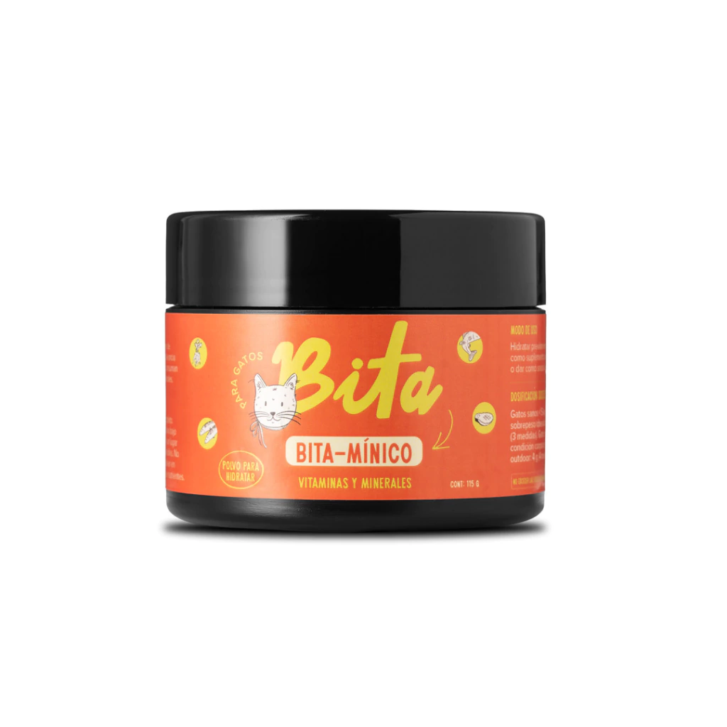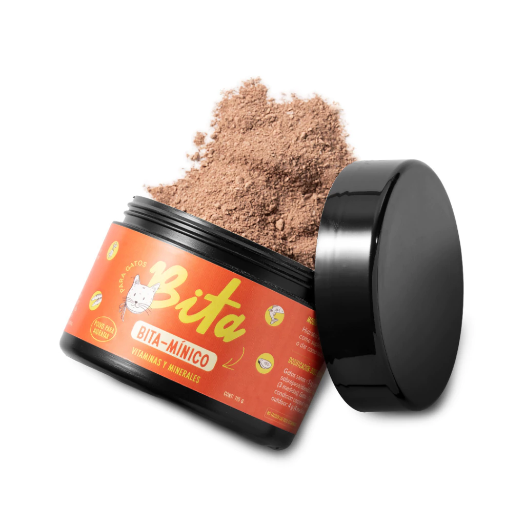 Bita-mínico Gatos es un suplemento natural en polvo diseñado para complementar la alimentación diaria de gatos, especialmente aquellas dietas caseras crudas o cocidas y también dietas ultra procesadas que lo necesiten.